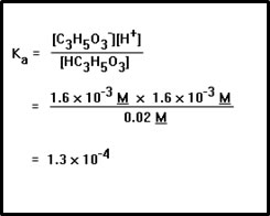 Now we substitute these values into the equilibrium constant expression to calculate Ka. Strictly speaking, we should round this answer down to 1 x 10-4 since the concentration of lactic acid was given to only one significant digit. Also, if you paid attention to the units in this problem, you noticed that the units of the answer are M, moles per liter, buth that we didn’t include them in the answer. |