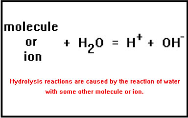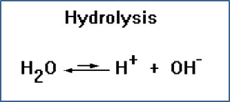 A hydrolysis reaction is one in which a water molecule breaks apart into H+, a proton, and OH-, a hydroxide ion.