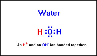 This is a bit of an oversimplification. It implies that the two hydrogen atoms in water are somehow different and, of course, they are not. What is true is that the hydogen-oxygen bonds are quite polar, so that the two hydrogens have a partial positive charge and the oxygen has a partial negative charge. It is therefore relatively easy to split one of the hydrogens off of the water molecule leaving the shared electrons behind, resulting in a H+ and an OH- ion. |
