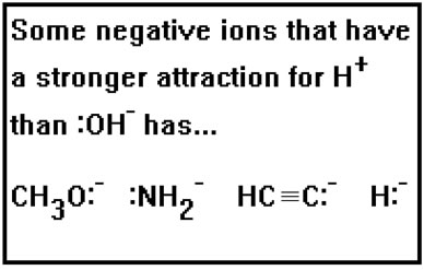 But there are other negative ions that have an even stronger attraction for the H+ ion than the OH- ion does. If one of these should be dissolved in water, it will have a strong tendency to “take” the hydrogen ions away from the water molecules and leave the OH- ions behind.