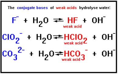 But a negative ion does not have to have a stronger attraction for H+ ions than OH- ions do in order to cause a significant number of water molecules to hydrolyze. The conjugate base of any weak acid will cause enough water molecules to hydrolyze to turn a solution basic. Most negative ions fit this description. In fact, our list of strong acids includes only six members: HCl, HBr, HI, HNO3, H2SO4, and HClO4. Their conjugate bases are Cl-, Br-, NO3-, HSO4-, and ClO4-. These very weak conjugate bases do not cause hydrolysis – their attraction for H+ ions is simply not great enough. All the other negative ions we will encounter form solutions of varying degrees of base strength when they are dissolved in water. |