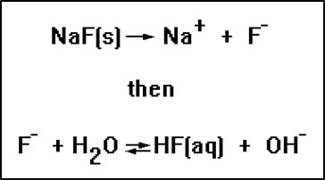 These ions can be added to water as part of a soluble ionic compound, usually a sodium or potassium salt. For example, when sodium fluoride is dissolved in water, the solution becomes basic because the fluoride ion causes a hydrolysis reaction. The second reaction occurs because HF is a weak acid. It is also necessary, of course, for the NaF to be soluble, or the second reaction never gets a chance to occur. However, virtually all sodium and potassium salts are soluble in water. |