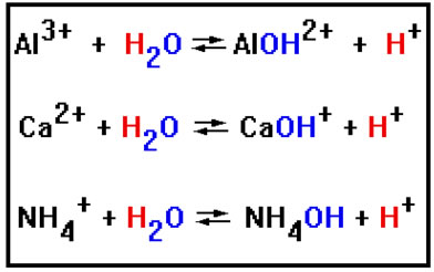 Positive ions can also cause hydrolysis reactions. But positive ions do so by binding to the OH- rather than the H+. As a result, positive ions cause the solution to turn acidic.