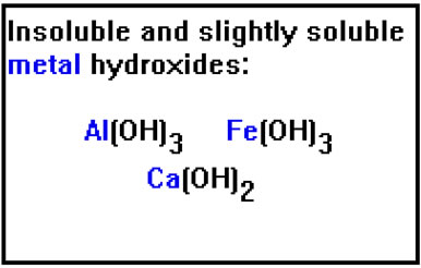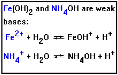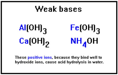 Just as the negative ions that cause basic hydrolysis come from weak acids, the positive ions that cause acid hydrolysis come from weak bases. You may recall that the list of strong bases included NaOH and KOH. RbOH and CsOH are also strong bases. LiOH is the only Group IA metal hydroxide that is not. The metal hydroxides in this list are weak bases because they do not dissolve well in water. They are either insoluble or only slightly soluble. |