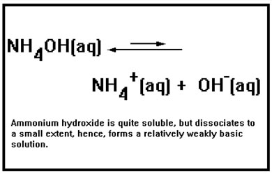 NH4OH is also a weak base. However, it can dissolve in water and so is very soluble. It is the one weak base we will encounter that is. The ammonium ion forms a weakly basic hydroxide because, like most positive metal ions, it has a relatively strong attraction for hydroxide ions. This is the property that results in acid hydrolysis. Unlike the metals, its undissociated hydroxide dissolves in aqueous solution because it can form many hydrogen bonds with water. |