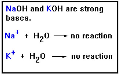 These, of course, are the positive ions associated with NaOH, KOH, RbOH, and CsOH. Since Ba(OH)2, Sr(OH)2, and AuOH are slightly soluble, the Ba2+, Sr2+, and Au+ ions do not cause appreciable hydrolysis as long as their concentration is low. |