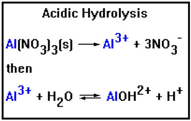 Ions that cause acidic hydrolysis can be added to a solution in the form of ionic compounds, usually as nitrates or chlorates, but sometimes as chlordies, bromides, iodides, or sulfates, depending on the solubility of these compounds. All nitrate, acetate, and chlorate salts are soluble. Chlorides, bromides, iodides, and sulfates can be soluble or insoluble, depending on which positive ion they are combined with.