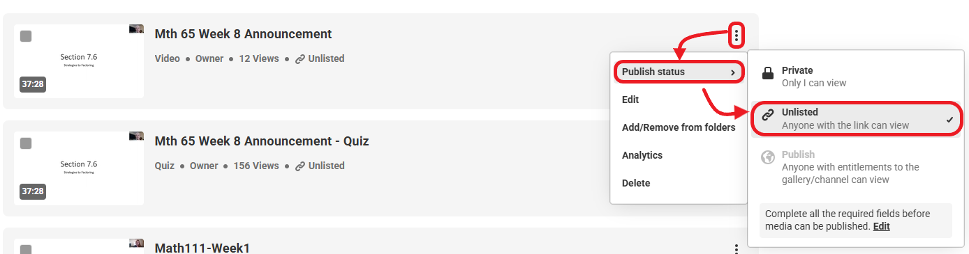 Point to Publish status, then select the Unlisted option from the drop-down menu.