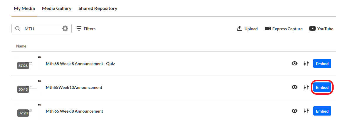 NOTE: If your video is not already available in Kaltura, you will need to click one of the 3 options at the top to Upload an existing video file, use Express Capture to record a new video, or add a YouTube link.