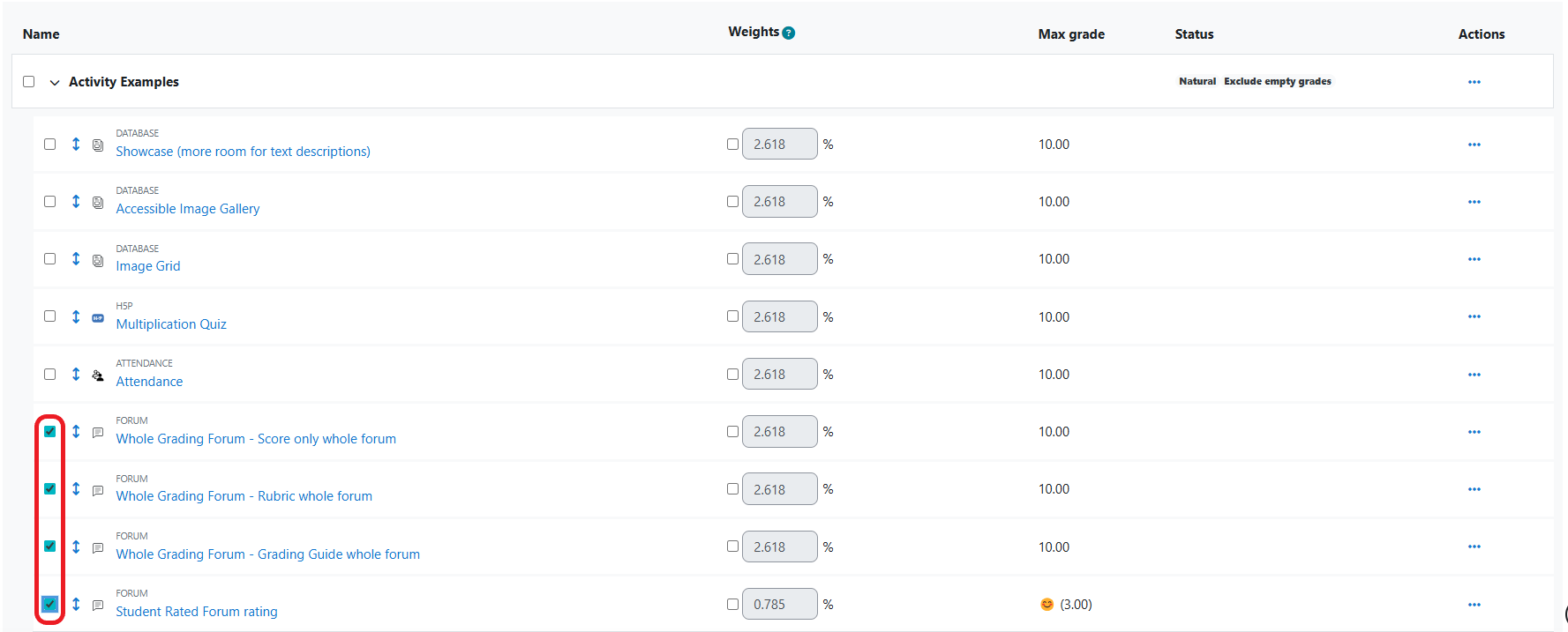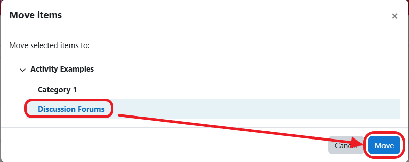 In the gradebook, you can move grade items one at a time to a specific location or you can move multiple selected grade items to a gradebook category.