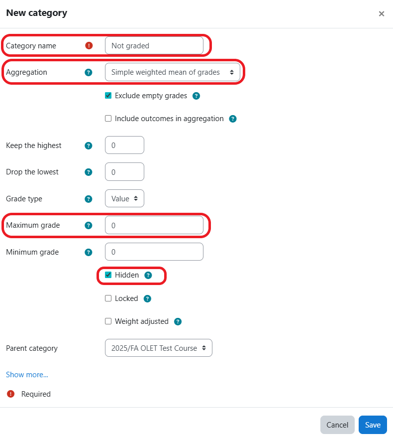 Sometimes you may have optional or hidden Moodle activities that show up in the User and Grader Report. This can cause course totals to not be accurate and confusion for students that are viewing the gradebook. We recommend that you follow these steps to create a hidden Not graded category to eliminate these issues.